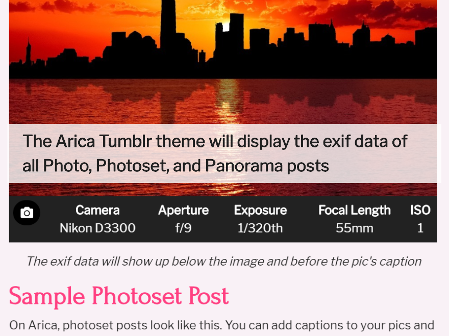 • Exif data: display the exif data of pics from photo, panorama, and photoset posts including aperture and focal length
